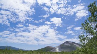 広葉樹林から急に視界が開けると、奥に硫黄山が見えてきます。すると足元に広がるのはイソツツジの群落です。例年6月下旬にはこのイソツツジの白い花が咲き、一面の花景色を見ることができます。