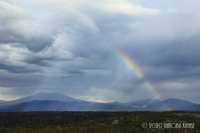 【日記】10月7日:藻琴山からおりてくると虹がかかっていました 日記 - Diary - 2020.10.072020.10.30 午前中はとても天気が良く藻琴山からの景色や中腹に広がるダケカンバの黄葉がとてもきれいだったのですが、午後から急に雨雲が湧き長いにわか雨を降らせていきました。久しぶりに雨の中の登山となってしまったのですが、中腹の紅葉の様子も見ることができたので、これはこれでよかったです。歩き終わると雨も止み、藻琴山からの帰り道では斜里岳に虹が半分ほどかかってくれました。