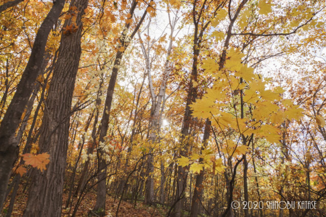 【日記】10月27日:森全体が黄色です 日記 - Diary - 2020.10.272020.10.30 今年は赤くなっている部分ももちろんありますが、森全体で見ると本当に黄色です。これはこれでなかなか見られないので、太陽の光が当たると黄色過ぎてまぶしいくらいです。遠くから見るのもいいですが、その森の中を歩くと、わぁ!っとちょっとした歓声が上がるほどです。踏みしめる落ち葉の音もカサカサといい音を立てて、虫もいないので、森歩きが一番楽しい時期です。