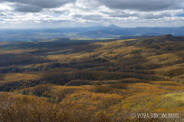 【日記】10月13日:西別岳の麓の黄葉がきれいでした 日記 - Diary - 2021.10.13 先週は西別岳の稜線から中腹までがきれいでしたが、今週はさらに標高が下がり山の麓に広がる広葉樹林がきれいに黄葉していました。こうして遠景で見るときれいなのですが、近くで見ると葉はすでに枯れ始めているというか、ピークになり切れずに枯れている感じなので、見下ろしてきれいなのも後少しだと思います。これからは屈斜路湖畔や川湯周辺の紅葉が見ごろを迎えるでしょう。