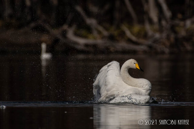 今季はずっと歩き回っていて、静かに時間を過ごすことがあまりなかったので、久しぶりにぼけ~っと屈斜路湖を眺めていました。オオハクチョウたちも静かな湖面にぷかぷか浮かびながら、水草を食べています。彼らの声が湖畔に響き渡る中、2羽ほどが湖面を羽でたたきながら羽繕いをしています。水しぶきを上げながら羽を湖にたたきつけては、くちばしで羽繕いしてを30分以上は続けていたと思います。ある程度羽繕いして気が済むと、またぷかぷか浮かびながらゆっくりと遠ざかっていきました。