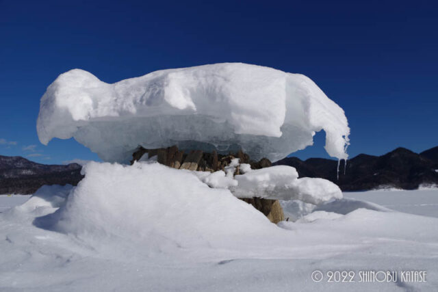 機会があって初めて糠平湖を訪れてきました。片道3時間のドライブとか久しぶり過ぎて運転するだけで疲れちゃいましたね。糠平湖はダム湖で水位が結氷していても変わるらしく、水位が下がり氷面が下がってくるときに、湖底にある切り株が氷を突き破ることで、切り株の上に氷が乗った姿がキノコのようだからきのこ氷と呼ばれているらしい。まだ数個しか成長していませんでしたが、来月はもっとできるらしいです。とても珍しい現象を見ることができました。いつかまた訪れてみたいですね。