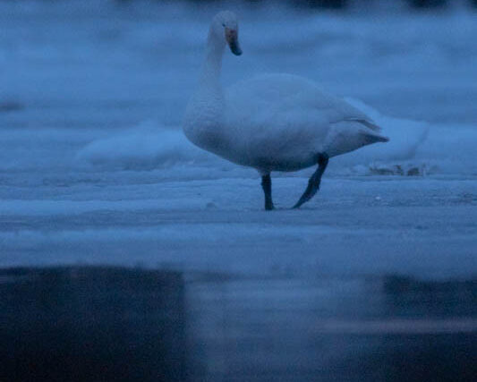 昼間の気温が高いので、屈斜路湖の氷がかなり薄くなってきました。太陽も沈み、薄暗くなってきた夕方に湖畔で黄昏ていると、オオハクチョウが見えてきた湖面に飛んできて着地してきました。白鳥はそこそこ思いですが、氷の上に乗れるほどの厚さでは残っているようです。今日は風も吹いていましたが、氷は壊れていかなかったので、もう少し時間がかかるのかもしれません。余裕を持っているといつの間にか氷が流れてなくなってしまうので、気にしてみていたいですね。