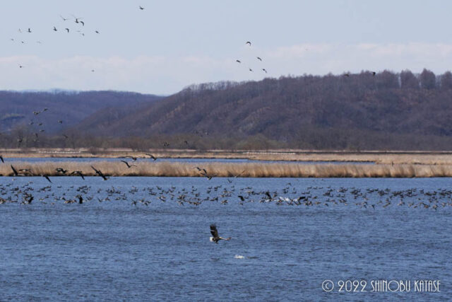 釧路に行く途中でシラルトロ湖沿いを走っていると、ヒシクイがたくさんプカプカ浮いていたので、ちょっと見ていると、アオサギが横切っていき、さらにたくさんのヒシクイたちが遠くから飛んできて湖に着水したと思ったら、上空をオジロワシが飛んできました。するとカモたちは騒ぎ出して湖の奥へ向かって飛び去り始めたのですが、飛び遅れた1羽のカワアイサがオジロワシに襲われはじめました。でもカワアイサは水に沈んでオジロワシの襲撃を回避するではないですか。オジロワシはカワアイサが水から浮かんできては下降して再アタックするのですが、何度トライしても捕まえることができません。最後は諦めてオジロワシは飛び去っていきました。オジロワシが飛んでいるときは騒がしかったカモの群れもその後は静かになりました。たまたま通りすがった時に目まぐるしく鳥たちが動き回ってくれて、なかなかない面白い瞬間を見ることができました。すごい久しぶりに別フィールドを巡るとやはり面白いですね。