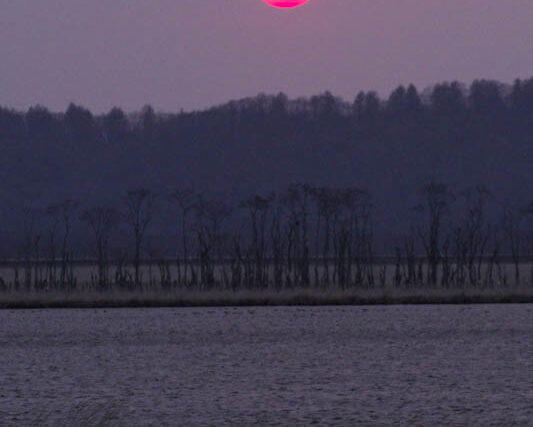 再び釧路に用事があったので、その帰り道にシラルトロ湖沿いを走っていると、ちょうど夕陽が沈んでいく瞬間でした。空のかすみと多分とても薄い雲だったのだと思いますが、があったお陰で真っ赤な太陽が湖の向こうに沈んでいきました。ちょうどその手前にタンチョウが立っていてくれて、まるで日本画みたいな風景を見ることができました。太陽はどんどんと沈んでいき、この風景が見られたのもほんの一瞬でした。先日のカモとオジロワシの攻防といい、今回といい、湖畔を歩けるようになっていたら絶対に面白い場所だと思うのだけれどなぁ。