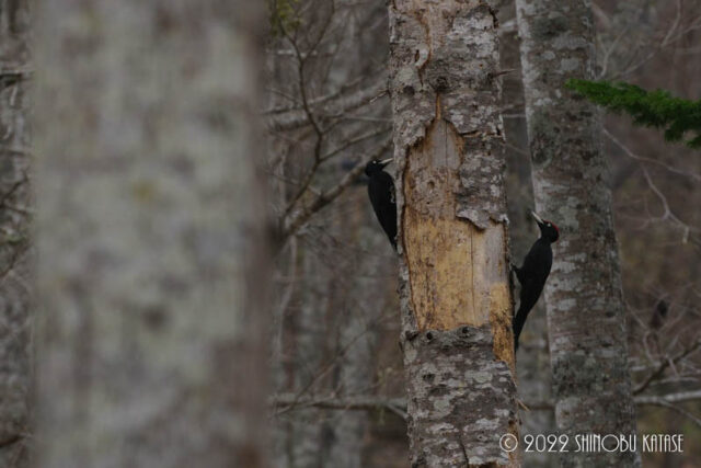 出かけようとしたら、クマゲラの鳴き声が近くで聞こえたので、声のするほうを見てみると、メスが木をつついていました。すると追いかけてくるようにオスも飛んできて同じ木に止まったのですが、オスがやってきて30秒もしないうちにメスは飛び去ってしまいました。オスはしばらく木をつついていましたが、メスが飛び去った方角へ追いかけるように飛んでいきました。デートだったのか、オスがただメスを追いかけていただけなのか、分かりませんが、なかなかオスとメスが同じ木に一緒にいる瞬間を見られないので、こういう出会いはうれしくなりますね。彼らはこれからどこかで子育てを始めるのでしょう。