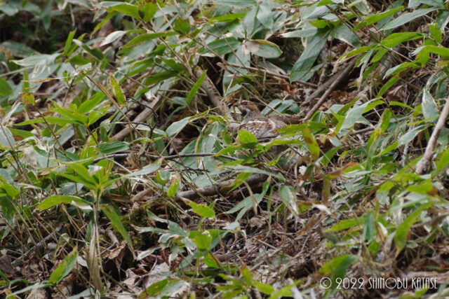 あるものを観察するために森の中でただただじっと待っていたら、すぐそこでガサガサと音がしました。少しびっくりしましたが、何かと思ってよく見てみたら、エゾライチョウが笹薮の中、地面をつつきながら歩いていました。音をたててくれなければ正直見つけられないですね。よくオスメスで行動していることが多いのですが、今回は一羽だけでした。雨が降ったり、晴れたりとあまり天気は安定していないですし、峠の上は風が吹いているとまだまだ寒いので、服装をどうするか悩む季節ですね。