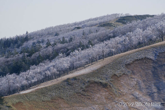 今朝は早朝の日差しが眩しくて、いつもより早くに目が覚めてしまったので、ライブカメラ見てみたら、摩周外輪山は霧氷になっていました。昨日の雨雲でできたのでしょう。晴れ渡っているので、間に合うか分かりませんでしたが、急いで摩周第一展望台に着いてみると、霧氷ではなく雨氷でしたね。でもやはりほとんど落ちてしまって、最後の少ししか無かったので、これなら第3はまだ残ってるはずだ、と急いで移動してみると、第3周辺は樹氷でしたね。きれいでしたが、こちらも氷が落ち始めていたので、落ちているのが分からないように、遠景を切り抜いてみました。摩周湖では6月に入ってからでも霧氷が見られることがあるので、また寒くて雨が降った日の次の日はもう少し早く現地に着けるようにしたいですね。