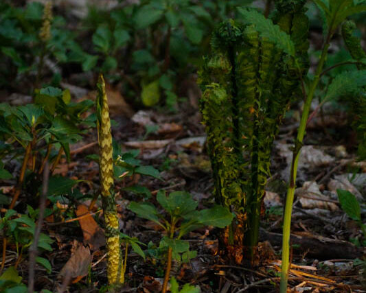 夕方そろそろ育ちすぎて採れなくなってしまうコゴミを探しながら森の中を歩いていると、面白い模様の植物が生えてきていました。コウライテンナンショウですね。花が咲いている時や実がなっている時は見たことあったのですが、生え始めたばかりのころって見たことが無かったので、とても新鮮です。このシマシマの模様が特徴的です。ちょうど夕陽がピンポイントで当たって暗い森の中で浮き立って見えました。昼間はエゾハルゼミが鳴き始め、緑もどんどん濃くなっていきます。夜には夏の大三角も上がってきたので、夏はもう目の前ですね。