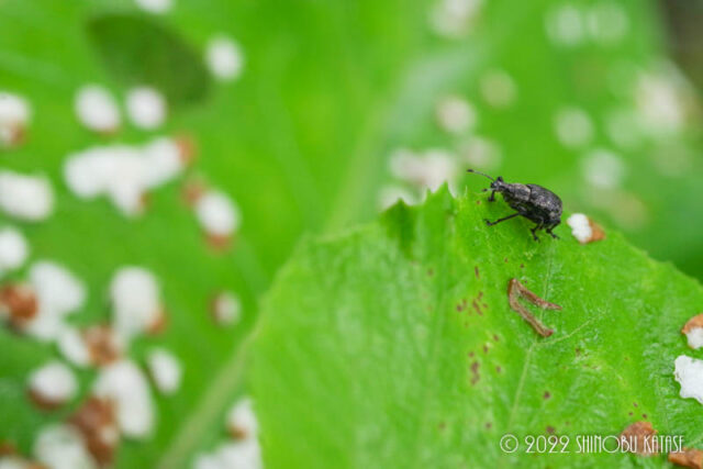 午前中はぽつりぽつりしていたものの、何とか雨が降らずに保っていてくれていましたが、午後からは普通に雨が降ってきました。夕方一瞬だけ雨が止んだので、外に出てみると、ゾウムシがフキの葉の上でじっとしていました。雨が降っていた時は葉の裏に隠れていたのだと思います。雨が止んで葉の上に出てきたものの、寒くて全然動いていません。とにかくじっと寒さに耐えているように見えました。その後また雨が降ってきて、結局夜まで降り続けていました。ゾウムシもまたたくさん種類がいて、何ゾウムシか分からないのですよね…。