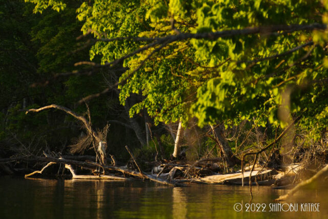 1日曇っていましたが、夕方になって雲が散っていき夕陽が差し込んできました。湖畔で佇んでいると、アオサギも遠かったですが湖畔で佇んでいる姿を見ることができました。ちょうど夕陽が新緑に当たってとても雰囲気は良かったですね。風もあまりなくて湖面は波も立っておらず静かな時間が流れていました。春は一生懸命営巣準備をしているアオサギですが、今はちょうど子育て中なのかな。いつか子育てしている姿も見てみたいですね。