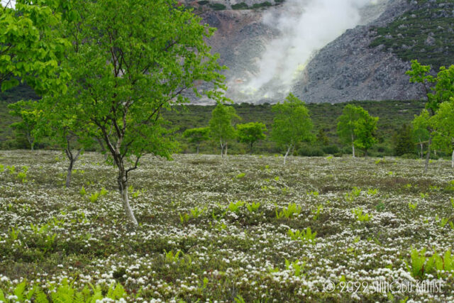硫黄山レストハウス裏のイソツツジが数日前は見ごろを迎えていましたが、川湯側(といっても普段の散策路から少し別の踏み分け道に入っていきますが)でも見ごろを迎え始めていました。散策路沿いのイソツツジもこれくらい咲き乱れてくれるときれいなのですが、ここ5,6年はなかなかきれいに咲いてくれないのですよね。でもだからこそ今年はどうかな?と確認しに行きたくなりますし、きれいに咲いている地点を探すのも楽しいですし、毎年違うからこそいいのですよね。