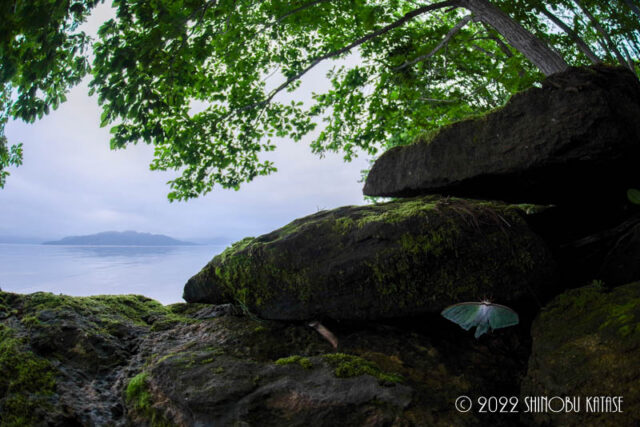 【日記】7月5日:オオミズアオが岩の影で休んでいました 日記 - Diary - 2022.07.052022.07.18 今年は飛んでいるオオミズアオがここ数年の中では多い気がします。でも、寿命で見られなくなったのもあると思いますが、すごい飛び回っているオオミズアオたちも天気が不安定で一気に姿が少なくなった気がします。雨も止んだので夕方湖畔で休んでいたら、岩陰に何かあると思ってよく見たらオオミズアオが岩陰に隠れて休んでいました。が羽もボロボロでやっぱり天気が影響を与えているのかなと思える夕方のひと時でした。