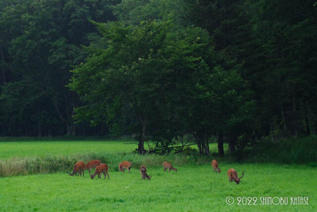【日記】8月5日:エゾシカのオスたちがウロウロしていました 日記 - Diary - 2022.08.052022.09.23 今日はエゾシカのオスたちが群れて牧草地で草を食んでいました。秋になるとバラバラに行動しているオスですが、それ以外の季節は群れて行動していることがあります。オスたちが群れているのはなぜでしょうか。普段あまり動物たちの生態を深く知ろうとは思わないのですが、よく見る動物たちくらいはもう少し詳しくなりたいですね。それにしも牧草地の草を食べられてしまったら農家さんたちは大変ですね…。