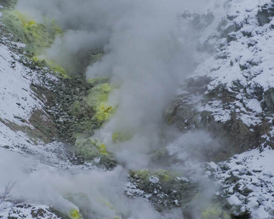 予報通り1晩中雪が降り続き、ついに積もりました。ただ気温がマイナスになっていないため、もうモサモサの重た~い雪が降り積もり、早めに日の出時刻と同時に起きて除雪を始めたのに、いつもなら1時間半くらいで終わる作業が3時間もかかってしまいました…。今年初の除雪だったので、クタクタになってしまったので、近場だけ見て回ってきました。硫黄山にも雪が降り積もり、噴煙周りの硫黄の黄色が際立っていましたね。川湯の森の中もいい雰囲気に変化してきていました。後数日はチラチラと降り続けるようです。ただまだまだ雪は締まっていないので、スノーシューで歩けるのは年が明けてからになりそうです。