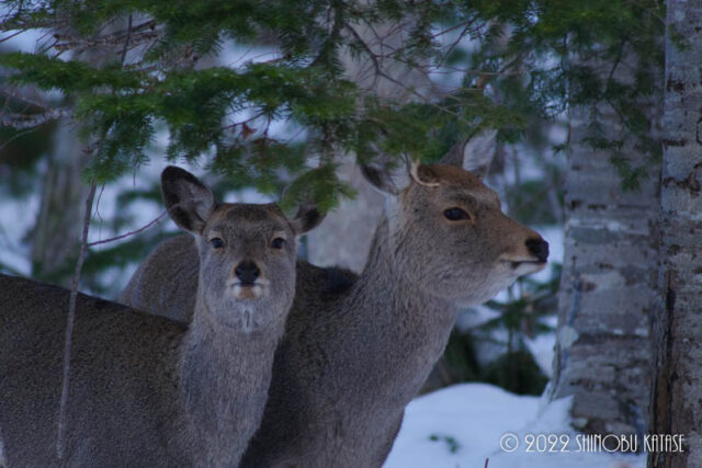 急に雪が積もったので、びっくりしていたのか、雪が深すぎて動くのが大変だったのか、たまたまここ数日見かけることが少なかったのですが、雪がだいぶ締まってきて歩きやすくなって移動範囲が広がったからか、シカがウロウロしているのを見かけました。雪を掘り返してササを探していたり、目線までの高さにある木の冬芽を食べたりしながら、ゆっくり群れで森の中を移動していました。今年は雪が多いので、シカにとっては厳しい年となると思います。春先は冬を越せなかったシカを見る機会が多くなるかもしれないですね。