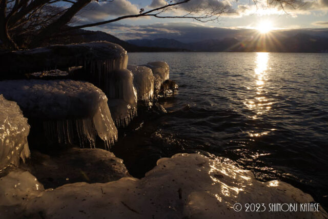 マイナス20度を下回る日が続いていましたが、寒さが緩んできました。もう少し寒かった時に風が強くなると、しぶき氷がもっと成長するのですが、あまり風が強くなかったので、氷は大きく成長していないものの、しぶきがかかっている湖畔は氷でコーティングされ始めています。先日薄氷が張った場所も微風で起こった波で壊されてしまっています。今年は阿寒湖の結氷もかなり遅れていたので、屈斜路湖は全面結氷してくれるかちょっと心配ですね。どうなるのか楽しみですね。