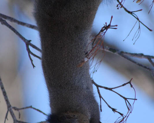 今までは昼間もずっとマイナスの気温だったのに、今日はいきなりプラス気温にまでなってしまい、昼間歩いていると暑くて汗が噴き出していました。そんな暖かな昼下がり、先日見たリスと同じ個体なのかは分かりませんが、同じカエデの木でリスが種を食べに来ていました。先日に比べてだいぶ種が少なくなってきているので、すごい恰好になってまで枝先からぶら下がっている種を食べていましたね。それにしてもこんな格好を維持しながら種を食べ続けることができるなんてすごいですね。