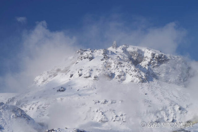 早朝はモサモサ雪が降っていましたが、11時頃、一気に晴れてきました。その雪雲が晴れてくる瞬間、まだ霧がかかっている硫黄山が噴煙と混じって、いい雰囲気の硫黄山を見ることができました。頂上に立っているろうそく岩がいいアクセントになっているんですよね。そのまま1日晴れていましたが、夜から曇ってきて明日の午前中まで風雪が強まる予報です。明日の午後は森の中を歩きに行く予定ですが、夜の雪がどれくらい積もっているのか楽しみですね。