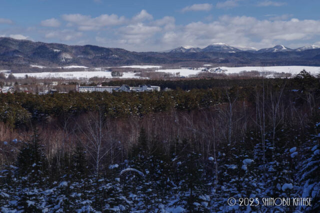 昨日よりも気温が高く、風も弱かったですが、依然として寒いですね。風はまだ吹いているので、屈斜路湖の氷は全然広がっていく気配がありません。とりあえず天気がいいので、川湯のスキー場跡地まで行ってみました。7年くらい前にこの跡地にはアカエゾマツの木が植樹されましたが、着々と大きくなってきていました。川湯を見下ろすことができるこの景色も後数年したら、完全に森に戻って見られなくなってしまうことでしょう。奥の山並みの向こうに斜里岳があるので、見られたらいいなと思っていましたが、残念ながら雲の中でした。
