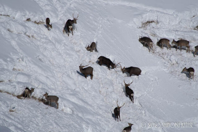 昨日摩周外輪山を歩いていると、なかなか出会うことのできないギンザンマシコを見かけたのですが、残念ながら望遠を持っていなかったので撮影できず、今日もいないかなと懲りずに摩周湖へ。残念ながら見つけることはできず、時間はあったのでそのまま第3展望台まで歩いてくると、展望台直下の内壁ではシカの数がすごいことになっていました。斜面でオス通しで角をぶつけ合う行為が見られたので撮影したのですが、これはほんの一部で全部で何頭いたのか分からないほどいましたね。ここ数年の中では今年は雪が多いので、内壁の雪が少ないところに集まるのは分かりますし、観光で来られる皆さんはシカがいると喜んでくれますが、ここまでくると植生への被害など心配になってきますね…。