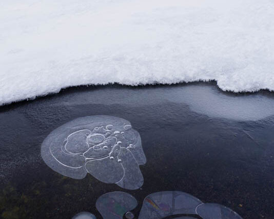 昼間の気温が少しずつ暖かくなってきて、湖畔の氷が緩み始めていますが、気温が下がる朝晩にまた薄い氷が張ったところに、アイスバブルができていました。湖畔が厚い氷に覆われていると、見られなくなってしまうアイスバブルですが、この寒さが緩み始める時期になるとまた姿を見ることができることがあります。ただ氷は薄いし、温泉も湧いているし、気温も上がるしで、昼間になると解けてなくなってしまいます。今日のアイスバブルは薄い氷にできていたので、PLフィルター通して何となく氷の結晶で色づいているのが分かりましたね。