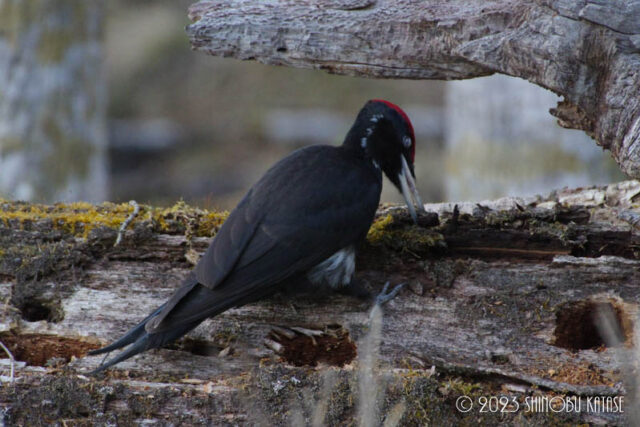 昼間少しだけ出かけることになって、帰って来てみると、車を止めたすぐ目の前の倒木でクマゲラが木をつついている姿を見ることができました。ずっと、つついていたので、しばらく見ていたのですが、とにかく夢中で、他のことをする様子もなく、夕方の作業をしなければならなかったので、そっと立ち去りました。その後15分後くらいに飛び立っていく声が聞こえたので、きっとずっとつついていたのでしょう。お腹いっぱいに虫を探すことはできたでしょうか。