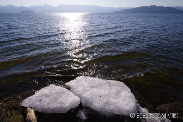 昨日はまだ湖面に氷が浮かんでいるのが見えましたが、今日は湖畔に出てみると流されて行って完全に見えなくなっていました。ただ湖畔に乗り上げてしまっていた氷は残っていて、取り残された姿がちょっと寂しげでした。奥にはオオハクチョウが浮かんでいて、波の音が響き渡ると、春が来たなぁと。桜が咲いたりすると春のイメージがありますが、ここでは屈斜路湖の湖面が見えてきたら初春で、桜が咲く時期は晩春な感じがしています。ここまで来たら野の花が咲き始めるのが楽しみですね。