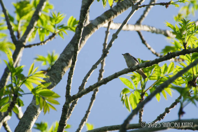 明日から始まる写真展を設営し終わって、夕方帰宅すると、頭上のヤチダモの木からいつも聞かない鳥の声がします。探してみると、またヒタギ科の鳥です。先日見たキビタキメスよりも体格が小さく、下嘴が黄色いので正体はコサメビタキでした。それにしてもほんと彼らは似ているので、写真に撮っておかないと、何か調べられません…。慣れればそうでもないのでしょうが、家の近くだとコサメビタキやキビタキって頻繁に見られないのですよね…。