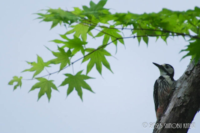 【日記】6月6日:オオアカゲラがいました 日記 - Diary - 2023.06.06 外で作業していると、クマゲラの声が聞こえてきたので、辺りを見回していると、声の主は見つけられませんでしたが、代わりにオオアカゲラがとても近くの木に止まってくれました。ちょうどハウチワカエデの葉と一緒に撮影することができて、雰囲気が良かったですね。森の奥からは鳥の鳴き声がたくさん聞こえてきます。そろそろこの春に育った幼鳥たちが巣立ち始めるころでしょうから、元気に飛び回っているのかもしれません。