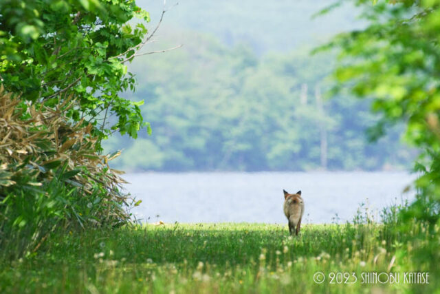 和琴半島の付け根を歩いていると、キタキツネが食べ物を探しながら、トボトボと歩いていました。この時期は子育てのために食べ物探しでウロウロしているので、キツネを見かけることが多い気がします。でもなかなか屈斜路湖と絡めてキツネを撮影できることができないのですが、和琴半島の付け根は狭いので、湖に向かって歩いていくキツネの姿を撮ることができました。野の花も春から初夏に移り変わっています。蚊も出始めていますが、まだアブが少ないので、6月から7月上旬くらいまで散策するには気持ちのいい日が始まります。