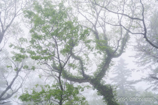 屈斜路湖から見ていると、ここ最近ずっと藻琴山は霧に包まれているような気がします。景色が見えるのって早朝の雲海だけなのではないでしょうか。何とか雲海に間に合ったらいいなと、8時くらいに藻琴山へ登りに行ったのですが、残念ながら雲海は標高をあげてずっと霧に包まれていました。でも霧の日だからこそ霧の中で際立ってくれるダケカンバが好きなんですよね。なかなか来られない方はこの景色を見てもなかなか共感してもらえないのですが…。予報を見ているとまだまだ同じ感じが続きそうです。晴れたら晴れたで暑いので、涼しくなってほしいと思うのですが、ここまでずっとうんかい雲に包まれていると、もう少し晴れ間があってほしいなと思ってしまいますね。
