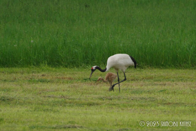 【日記】6月16日:タンチョウの親子が牧草地で食べ物を探していました