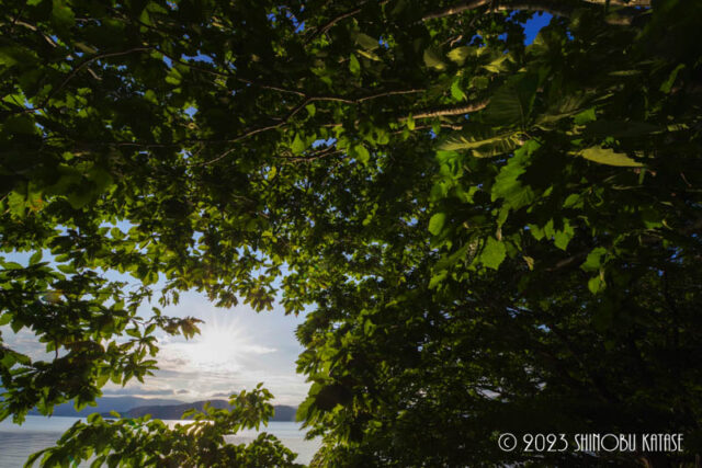 しばらく天気が悪かったのですが、午後からやっと晴れ間が見えてきて、外輪山に沈んでいく太陽を久しぶりに見ることができました。いつも通り湖畔に立って写真を撮っていたのですが、せっかくなので、色が濃くなってきた深緑と一緒に撮りたいなといつもとは違う視点に立ってみました。しばらく太陽が見られない日が続くと、日の光はやっぱりうれしいですね。明日もこのまま天気がいい予報なので、平日ですがお出かけ日和となりそうですね。