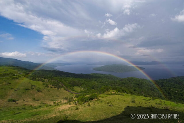午前中の仕事が終わり、遅い昼食を食べ終わると、雲海が霧散した後の雲1つない午前中から想像できないほどの雲が一気に湧き上がって、予報に全然なかったにわか雨が降り始めました。急に胸がざわざわし、なんだか風景に呼ばれた気がして、雨雲レーダーを見てみると雨雲は1時間程度で通り抜けるとまた晴れてくるようです。もしかして美幌峠から屈斜路湖にかかる虹が見られるかもしれないと、車を走らせてみると、ほんとドンピシャで虹がかかってくれました!ずっと峠から見下ろした屈斜路湖にかかる虹が見てみたいと思っていたのですが、ついにその時が来て独りで興奮してしまいました。今道の駅でやっている写真展に追加したいくらいです。こういうことがあるからやめられないです。