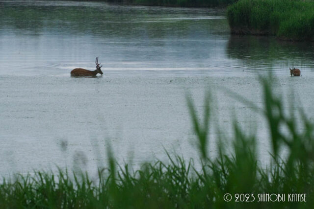 【日記】7月11日:オスジカが水浴びしながら水草を食んでいました