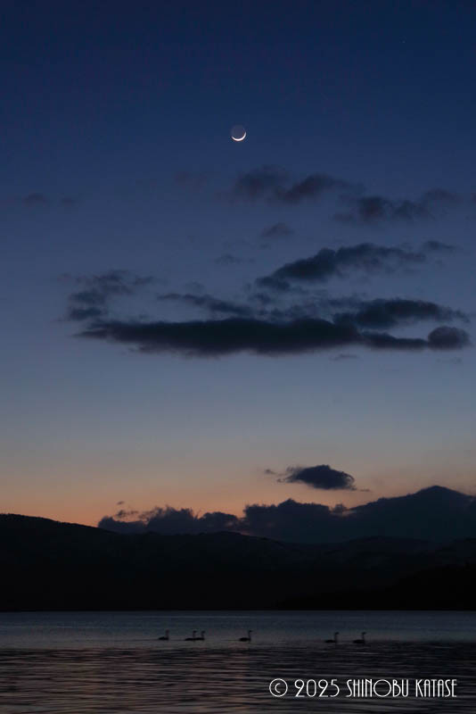 夜空の月は明るすぎてその形をきれいに撮影できません。そのため、ちょうど日の入り直後や直前でなければ、うまく写せないのでなかなかチャンスがありません。今晩はちょうど残照の中沈んでいくなと思って見ていました。しかも三日月だったので、とても細く、光の当たっていない部分でも月の輪郭が見える地球照まで見られました。調べてみると地球に達した太陽の光が地球に反射して月に届くことで太陽の光が当たっていない月の部分まで見られる現象のようです。ちょうどその下をハクチョウたちが横切っていきました。