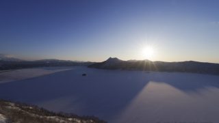 結氷が進んでいた摩周湖。昨晩はとてもきれいに星が見えていましたが、朝方にぱらっと雪が降ったのでしょう。昨日までとても不思議な模様の氷が見えていましたが、いきなりの大雪原となってしまいました。これはこれでなかなか無い景色です。太陽が昇ってくると、摩周岳や外輪山の影がどーん!と雪原に伸びていました。まだ最後に凍った奥のほうや摩周岳の麓辺りは凍っていないポイントでは水が沁みだしているので、まだ全面入っていないのが分かります。このままいけば明日には全面いくのではないでしょうか。