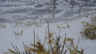 なかなか天気がぱっとしないですね…。風で雪が吹き飛んだ湖面も日差しが差し込まないので、青くなりません。昼間は風が強く、雪面の粉雪が舞い上がっていましたが、今晩は風が弱くなって、また雪が降ってくる予報なので、きっと摩周湖は多少雪原に戻ってしまうのではないでしょうか。昼間は日差しがかなり強くなってきているので、雪が降ったら、次はそのまま広範囲で氷にくっついてしまうのではないでしょうか。毎日違う景色を見せてくれるのはとても面白いです。