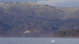 昨晩、ついに低地でもぱらっと雪が降ってきましたが、今朝の天候は安定していました。あまりくっきりと見られるわけではないですが、水温と気温の温度差でこの時期には屈斜路湖の対岸に下位蜃気楼だと思うのですが、を見ることができます。オオハクチョウもプカプカと湖面に浮かんでいて、静かに湖を見ることができるのがこの時期ならではですね。