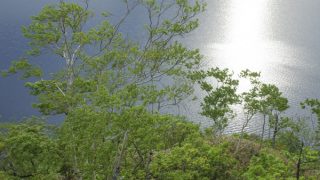 今朝はとてもきれいに摩周湖の湖面を見ることができました。到着時は曇っていましたが、雲の切れ間から日が差し込んでくると、光が湖面で反射し、まるで一筋の柱がとろけ込んでいるような情景を見せてくれます。外輪山では芽吹いてきた緑が若々しいさわやかなグリーン色を放ち、緑と青と光のコラボレーションな景色を見せてくれました。