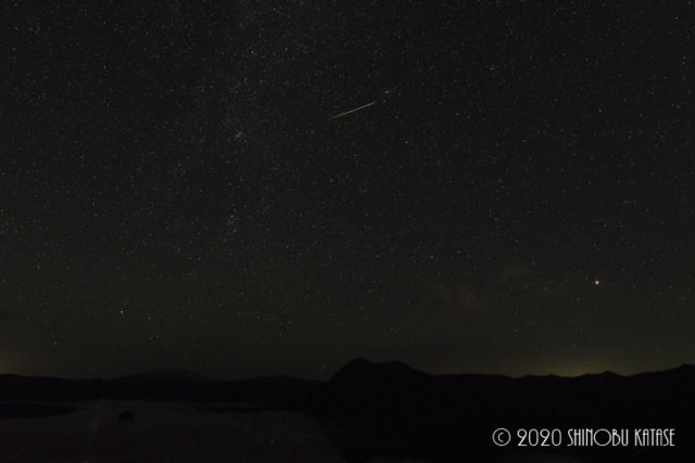 【先月の一枚】ペルセウス座流星群と摩周湖 過去掲載 2020.09.012023.12.26 弟子屈に来てからというもの、8月はもろ霧シーズンのため、昼間は晴れていても夜になると霧に包まれるのが当然で、一度も見ることができませんでした。しかしついに今年ペルセウス座流星群を摩周湖で見ることができました。夜の摩周湖であそこまでの訪問者があったのはきっとここ数年ではきっと初めてだったのではないでしょうか。とても多くの方が流星群を見に訪れ、展望台に寝そべったり、カメラで写真と撮ったり各々時間を過ごされていました。