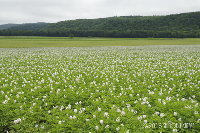 続いてじゃがいもの花です。遠くからではそば畑のようにも見えますが、近くで見ると、1つ1つの花はそばよりも大きく、可愛らしいお花が一面に咲いている様子を見ることができます。