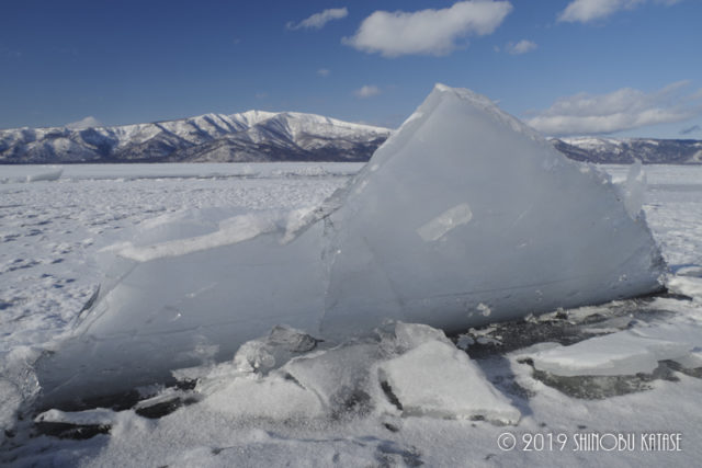 そろそろ御神渡り現象がピークを迎えているかもしれないと様々な場所を訪れていました。2019年は普段見ることができない場所でも氷が盛り上がっている場所があり、先日氷に亀裂が入っていた場所でも御神渡り現象ができているのが遠くから見ても分かるほどに競り上がっていました。近づいてみると、やはり氷丘脈となって沖に伸びています。氷の競り上がり自体はあまり高くなっていませんでしたが、それでも奥の方まで続いている様子はまるで足跡のようですね。