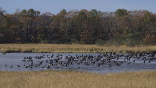 紅葉の時期、道東の湖沼で群れになっているのが、ヒシクイです。旅鳥である彼らは繁殖地から本州にある越冬地へと移動している最中で、春の北へと帰っていく時期と合わせて2時期しか出会える機会がありません。